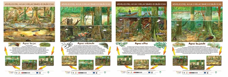 These are four posters which show the changes in the levels of rivers in the Amazon rainforest and the ecological relationships implied in such changes. The posters were presented as a pedagogical tool to promote the understanding of seasonality in the region among children and adults.